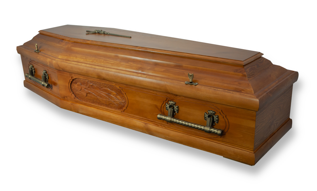 Der “Kalia” Kiefernsarg ist aus getrocknetem Kiefernholz hergestellt. Das Platzieren von Brettern entlang des Sargbodens garantiert eine hohe Festigkeit und Dichtheit. Die maximale Tragfähigkeit des Sarges beträgt 160 kg. Der Sarg ist mit mattem Lack überzogen.