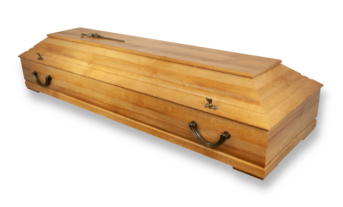 Der “Ungarisches Eichenfurnier” Kiefernsarg ist aus getrocknetem Kiefernholz hergestellt. Das Platzieren von Brettern entlang des Sargbodens garantiert eine hohe Festigkeit und Dichtheit. Die maximale Tragfähigkeit des Sarges beträgt 160 kg. Der Sarg ist mit mattem Lack überzogen.